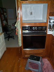 Here is a "before" photo of the area the microwave used to be. The white flakes all over the floor are pieces of old shelf liner I had to scrape off.